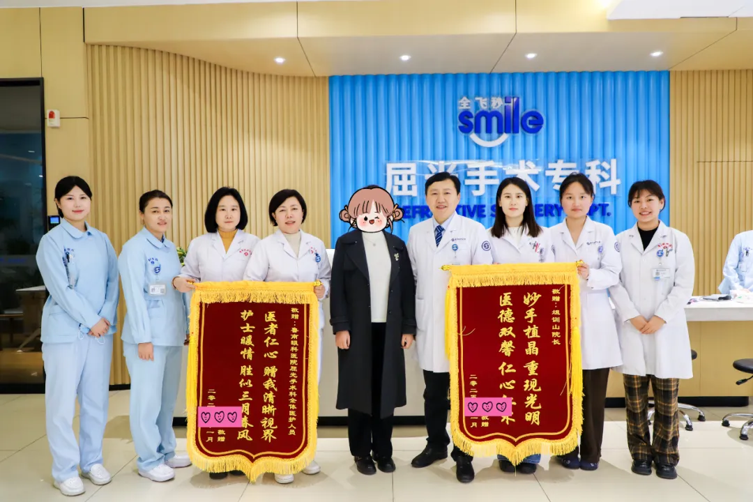 近千度的高度近视曾让于女士的世界长期笼罩在模糊之中,如今重获清晰视界,那份喜悦与激动难以言表。为表达这份沉甸甸的谢意,于女士特意定制了两面锦旗送到屈光手术科。