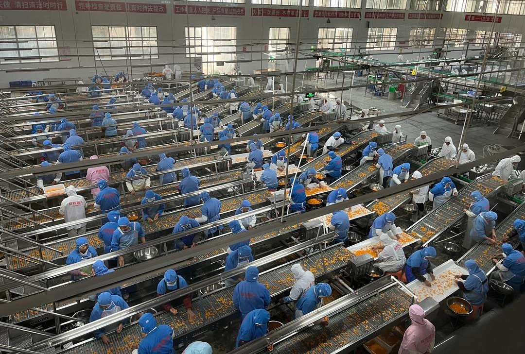 山东辉煌食品有限公司生产车间,流水线上的工人正在分拣黄桃