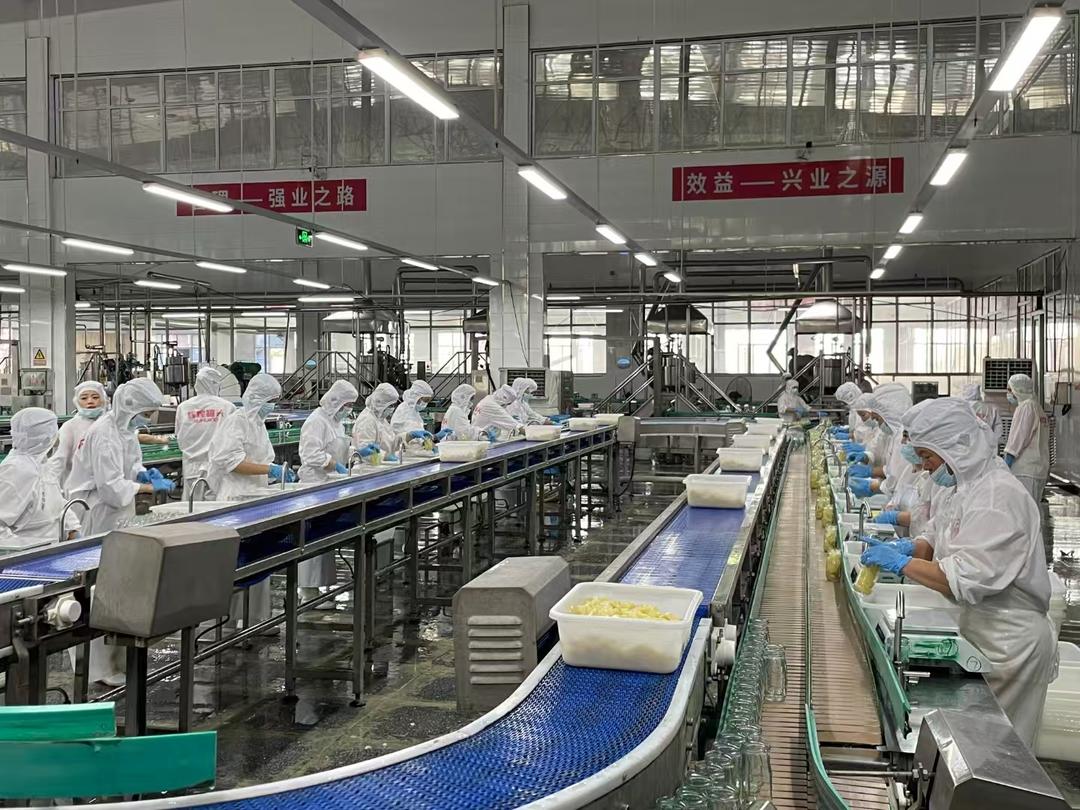 走进11月21日的山东辉煌食品有限公司生产车间内,一股混合着清甜果香与蒸腾热气的暖流扑面而来。清洗、去核、去皮、灌装......全自动流水线匀速运转,工人们在对经过面前的每一块水果肉进行快速分拣与检查。