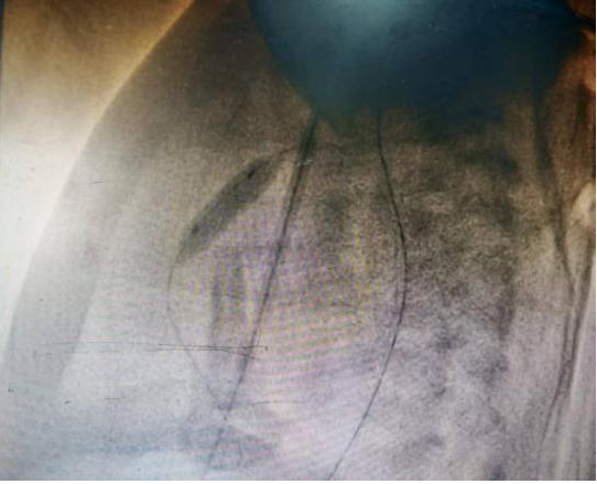 图中为肺动脉球囊扩张即刻,狭窄腰征消失,达到有效扩张